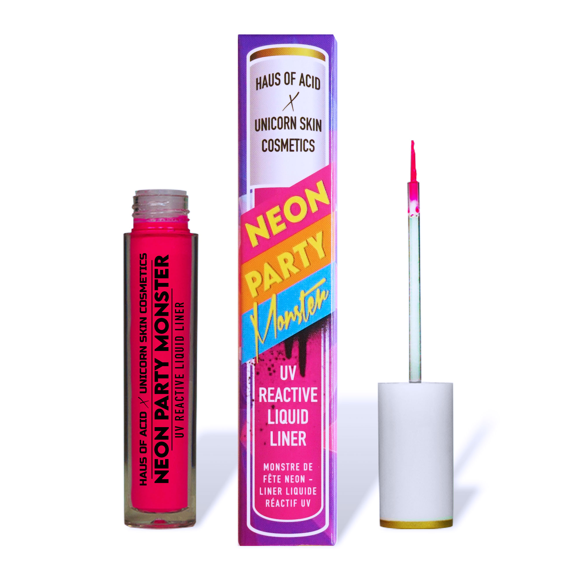 Introducing the NEON PARTY MONSTER UV Reactive Liquid Liners from Haus of Acid, in collaboration with Unicorn Skin Cosmetics! Get ready for an extraordinary experience that will leave you speechless and glowing in the dark!